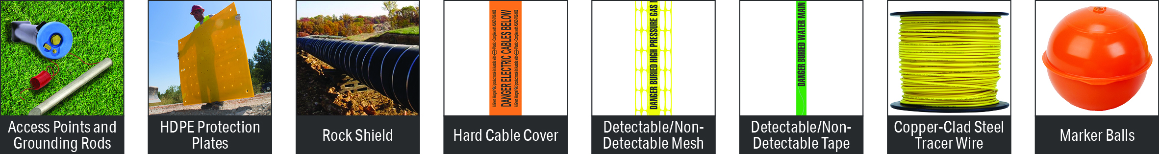 Our products are used by major gas, telecommunications, electricity and water utility providers, and our range includes access points and grounding rods for easy location, HDPE protection plates, hard cable cover, detectable and non-detectable warning tapes and meshes, rock shield, tracer wires, location markers and RFID systems.